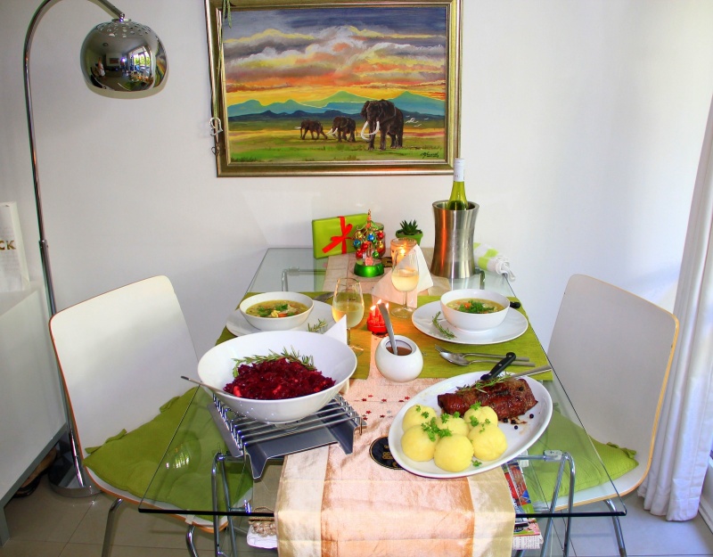 Eierflockensuppe mit Hühnchen. Gefülltes Straußenfilet mit Orangen, Apfel und Cranberry nebst gereichtem Rotkraut und Klößen als Sättigungsbeilage. Ein leichter Weißwein als Erfrischung, gepaart mit dem prägnanten Duft brennender Räucherkerzen. Im Hintergrund ein blinkender Weihnachtsbaum im Miniaturformat.